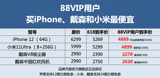由此,88VIP用户买各类商品都能获得最划算的价格,中新经纬客户端在小米的天猫旗舰店里就看到:用88VIP消费券买小米11 Ultra,最高能省1100元;此外像iPhone 12手机最高也能省1610元。