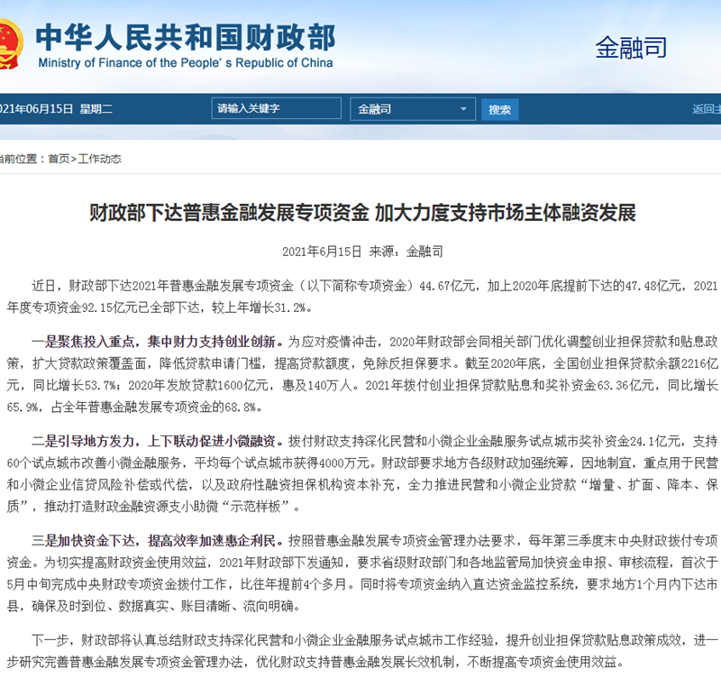 中国网财经6月15日讯 据财政部网站消息,近日,财政部下达2021年普惠金融发展专项资金(以下简称专项资金)44.67亿元,加上2020年底提前下达的47.48亿元,2021年度专项资金92.15亿元已全部下达,较上年增长31.2%。