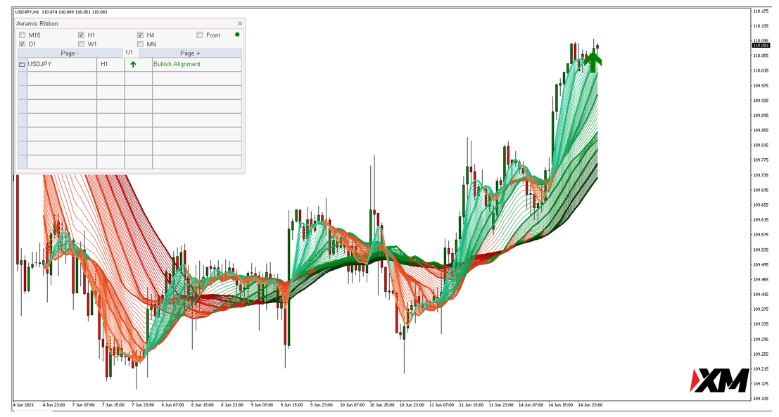Avramis Ribbon系统显示美元兑日元 USDJPY在H1级别形成看涨排列信号。