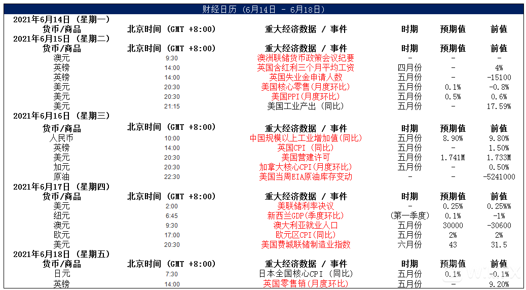 避险货币方面,日内,美元指数小幅下跌,主要是因投资者已经将注意力转向周三的美联储政策决定,目前市场预计美联储将维持政策利率不变、每月1200亿美元的购债规模不变,并再次淡化缩债的言论。今晚20:30,美国将公布5月零售销售月率,市场预期美国5月零售销售月率为-0.8%,这对美元也构成了一定压力。整体来看,美元仍面临一定,但下行空间或许有限。