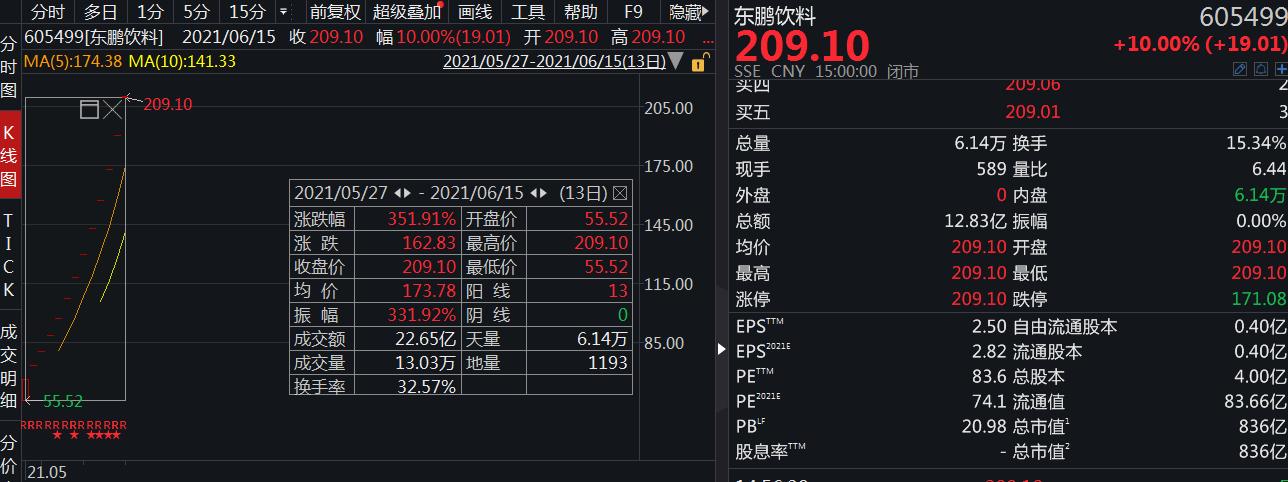 5月27日上市的东鹏饮料被称为“中国功能饮料A股第一股”,上市以来已收获13连板,股价累涨351.91%,总市值达836亿元。