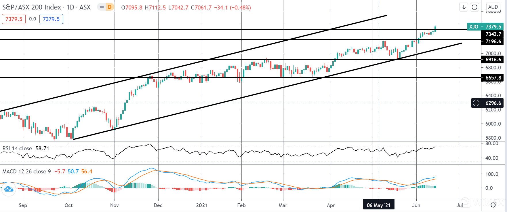 随着牛市通道的进一步发展,ASX 的反弹使该指数突破了 7343.7 的水平。不过 RSI 和 MACD 都看涨,RSI 处于超买区域,MACD 显示看跌背离,警惕任何反转走低。如果价格回到 7343.7 水平以下,7196.6 和上升通道低点是下一个值得关注的支撑区域。