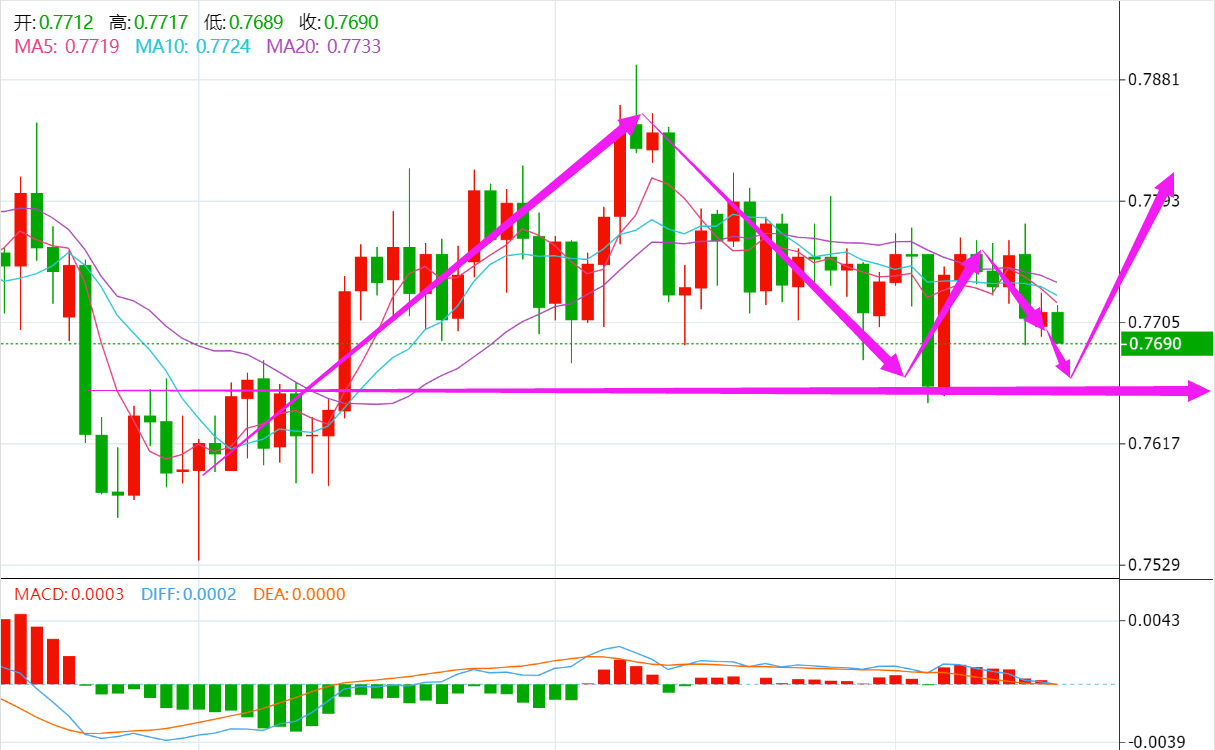 澳美汇率触及0.7780高点后再度受阻回落,短线跌破0.7700关口,下行动能偏弱,整体维持多重底形态构筑格局,左侧低点于0.7660附近构成形态支撑,中期反弹走势尚未扭转,建议回调止跌后逢低做多。 稳重者:入场位:0.7570-0.7620,止损位0.7520,目标位0.7710。 激进者:入场位:0.7610-0.7660,止损位0.7560,目标位0.7740。