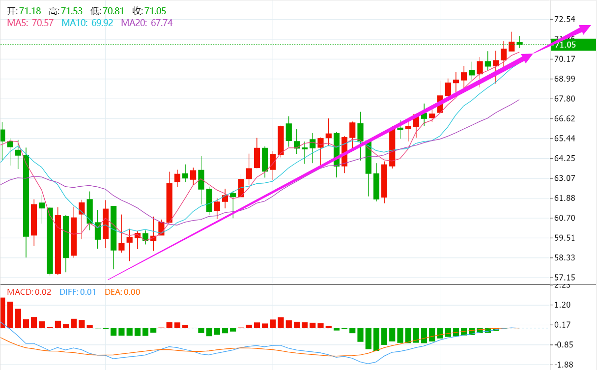 油价完成回踩确认走势后急速拉升,目前触及71.50近期新高点,午后虽有回落但止步于71.00关口上方,整体维持上行通道,高点持续高新,短线面临回调压力有进一步下探支撑风险,建议回调止跌后逢低做多。 稳重者:入场位69.70-70.20,止损位69.10,止盈位71.50。 激进者:入场位70.10-70.60,止损位69.60,止盈位71.90。