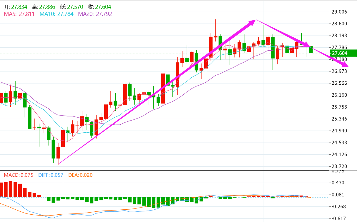 银价触及29.00高点后不断回落,午后下行至27.60附近,上行压力逐步显现,反弹高点下移特征明显,左侧盘整区间高点构成形态压制,回调风险再度浮现,反弹阻力下移至27.80-28.10区间,建议反弹遇阻后逢高做空。 稳重者:入场位28.10-28.40,止损位28.70,止盈位27.60。 激进者:入场位27.80-28.20,止损位28.50,止盈位27.40。