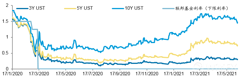 上周美国5月CPI数据公布,CPI同比增长5%,高于市场预期的4.7%;核心CPI同比增长3.8%,高于市场预期的3.5%。这也是CPI数据连续第二个月超预期上行。数据公布后,美元指数震荡,美债收益率小幅上行,随后整体走跌,尤其是10年期国债在周尾跌穿1.50%。本周市场重点关注美联储议息会议、美国初次申请失业救济金数据、中国零售销售数据。