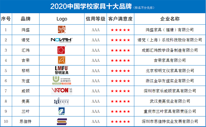 附:2020中国学校家具十大品牌(排名不分先后)
