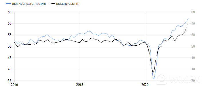 美国整体经济宏观来看似乎重启迅速,消费者物价水平高涨,工业及服务业PMI均显示出强劲的爆发上涨力度,居民的名义收入也在增长。