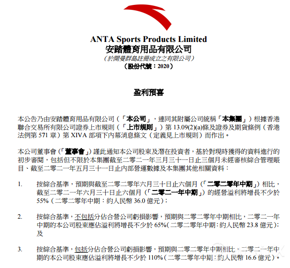 股价大涨的部分提振因素在于安踏在昨日盘后发布盈喜,整体的业绩预告要比外界预期更为积极,对2021年上半年业绩预测显示,今年上半年经营溢利或将同比增长不少于55%,不包括合营公司AMER影响的归母净利润同比增长不低于65%;包括分占合营公司亏损影响,预期与2020年中期相比,2021年中期的公司股东应占溢利将增长不少于110%。