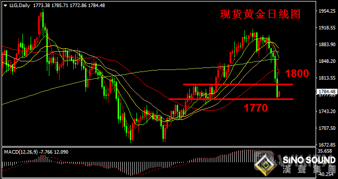 在周四凌晨美联储鹰派立场影响下,美元指数强劲上涨,美元指数向上突破91关口后,最高升至91.91,现报91.84。同时,10年期美国国债收益率上升,令金价承压。黄金面临技术性抛售,加剧了金价的跌势,昨日金价跌破1800大关后,并一度跌破关键支撑位1770美元。