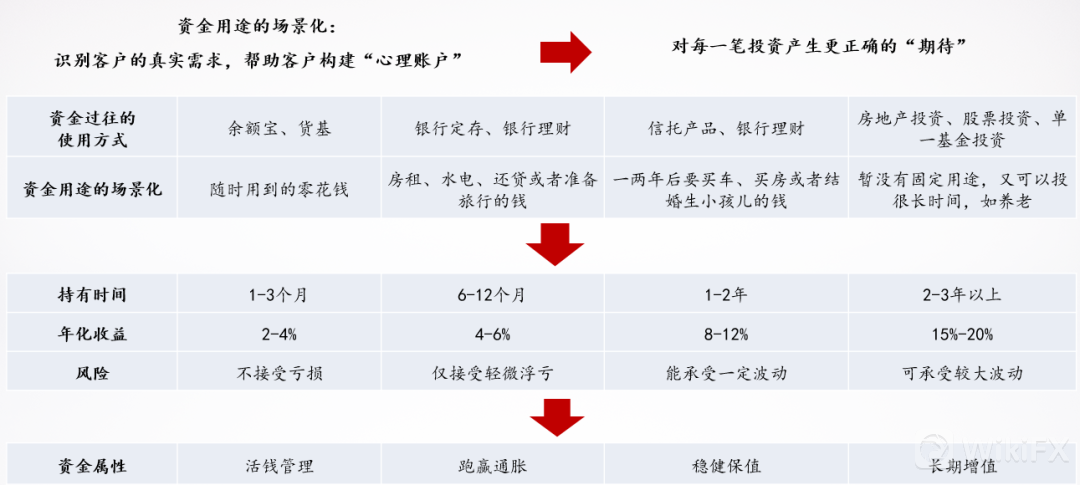 那应该怎么去确定自己的风险偏好呢?答案就是投资前确定自己这笔钱的“资金属性”。例如,我们建议可以把自己的家庭可支配资产分为“四笔钱”:活钱管理、跑赢通胀、稳健保值和长期增值的钱。它们分别对应者不同的使用场景和持有期限,包括短期几周随时要用的零花钱、季度或者半年度用来打理家庭的钱、1-2年里想去追求美好生活的钱以及3年以上长期可以用来做高风险投资的钱。