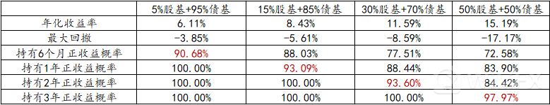 过去五年不同基金配置下的年化收益及正收益概率