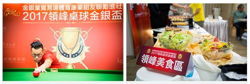 本届领峰桌球金银杯的宗旨是“通过桌球比赛,巩固行员友谊,联系感情,团结业界”,领峰全力支持此次赛事,也是为了加强行员之间的交流,通过体育运动,凝聚业界精神。作为唯一的赞助方,为能提供一个宽敞、舒适的环境给参赛选手们,领峰根据国际桌球比赛对场地空间的严格要求,细心调整了每一张球桌的位置及照明,由于当天观赛的嘉宾及拉拉队人数众多,也特别提前准备了坐垫及靠枕,以供有需要的观众使用。而考虑到赛时较长,公司更精心设置了“领峰美食区”,为现场所有出席人士供应色香味俱全的可口餐饮。