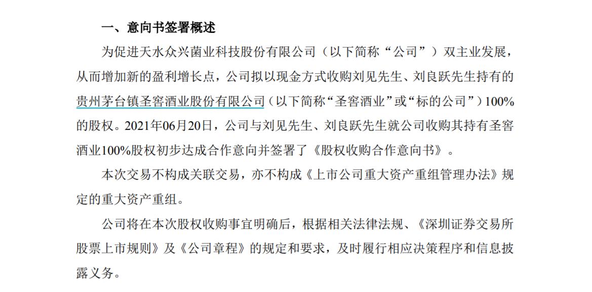 20日晚间,众兴菌业发布公告称,为促进双主业发展,增加新的盈利增长点,公司拟以现金方式收购刘见、刘良跃持有的贵州茅台(600519)镇圣窖酒业股份有限公司(下称“圣窖酒业”)100%的股权。6月20日,公司与刘见、刘良跃就公司收购其持有圣窖酒业100%股权初步达成合作意向并签署了《股权收购合作意向书》。本次交易不构成关联交易,亦不构成重大资产重组。