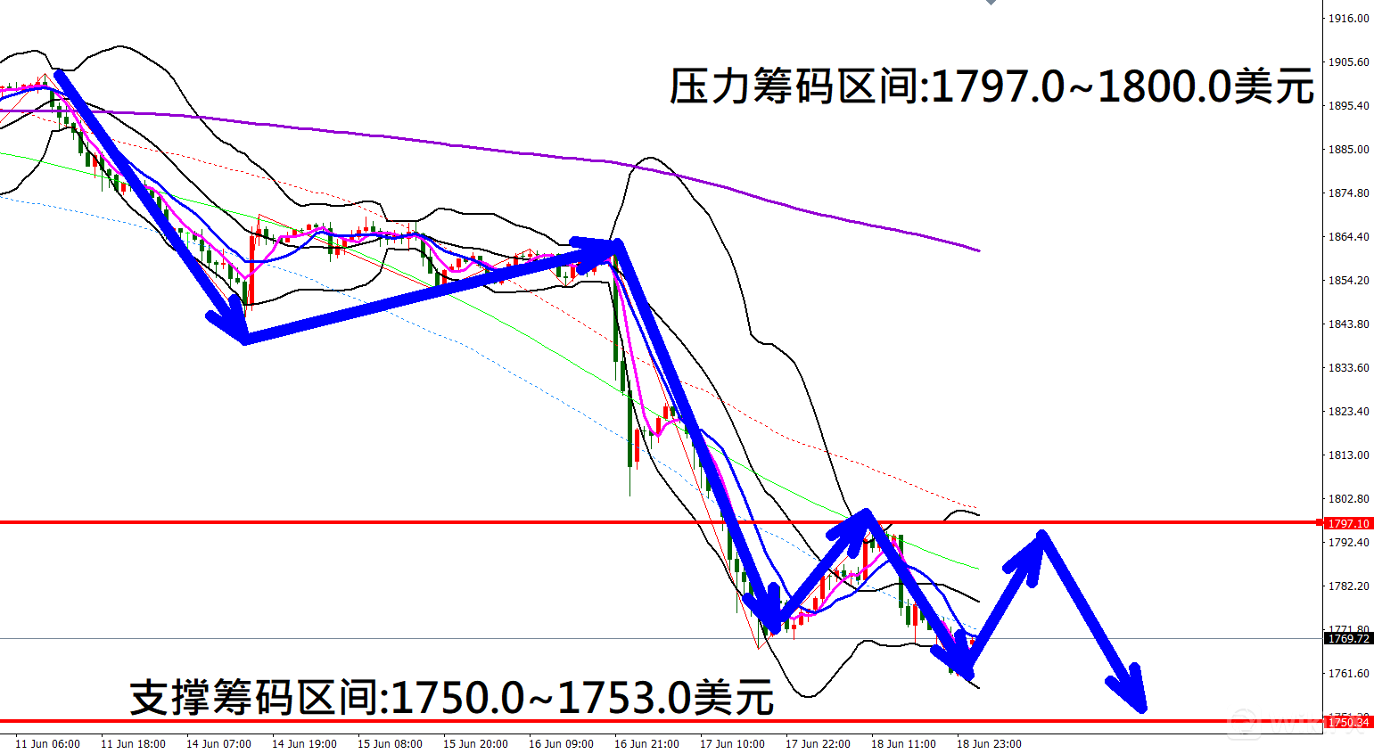 今日黄金(6月21日)早盘在1763.9美元/盎司附近,从技术分析面切入1小时级别观察走势架构上周五(18日)K棒盘中反弹遇压后再度大幅下跌,目前K棒落在布林通道中轨与下轨之间,同时开口持续朝下,因此有机会持续向下修正。