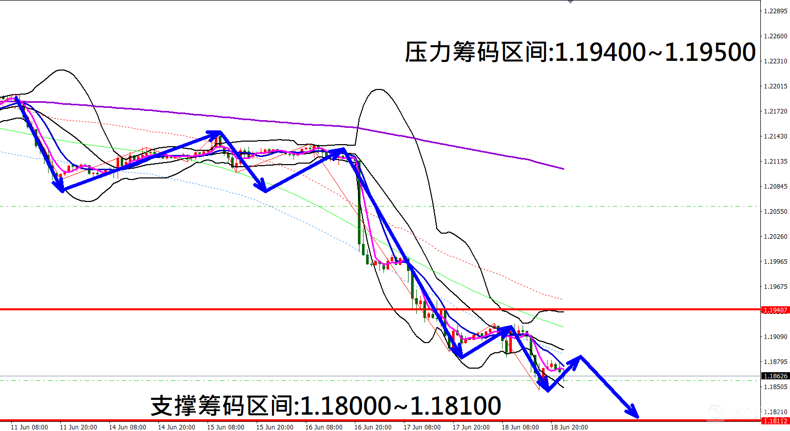 今日欧元/美元(6月21日)早盘在1.18632附近,从技术分析面切入,1小时级别观察走势架构符合上周五(18日)预测K棒持续重挫下跌,目前K棒落在布林通道中轨与下轨之间,同时开口持续朝下扩张,因此有机会反弹遇压后再度向下修正。