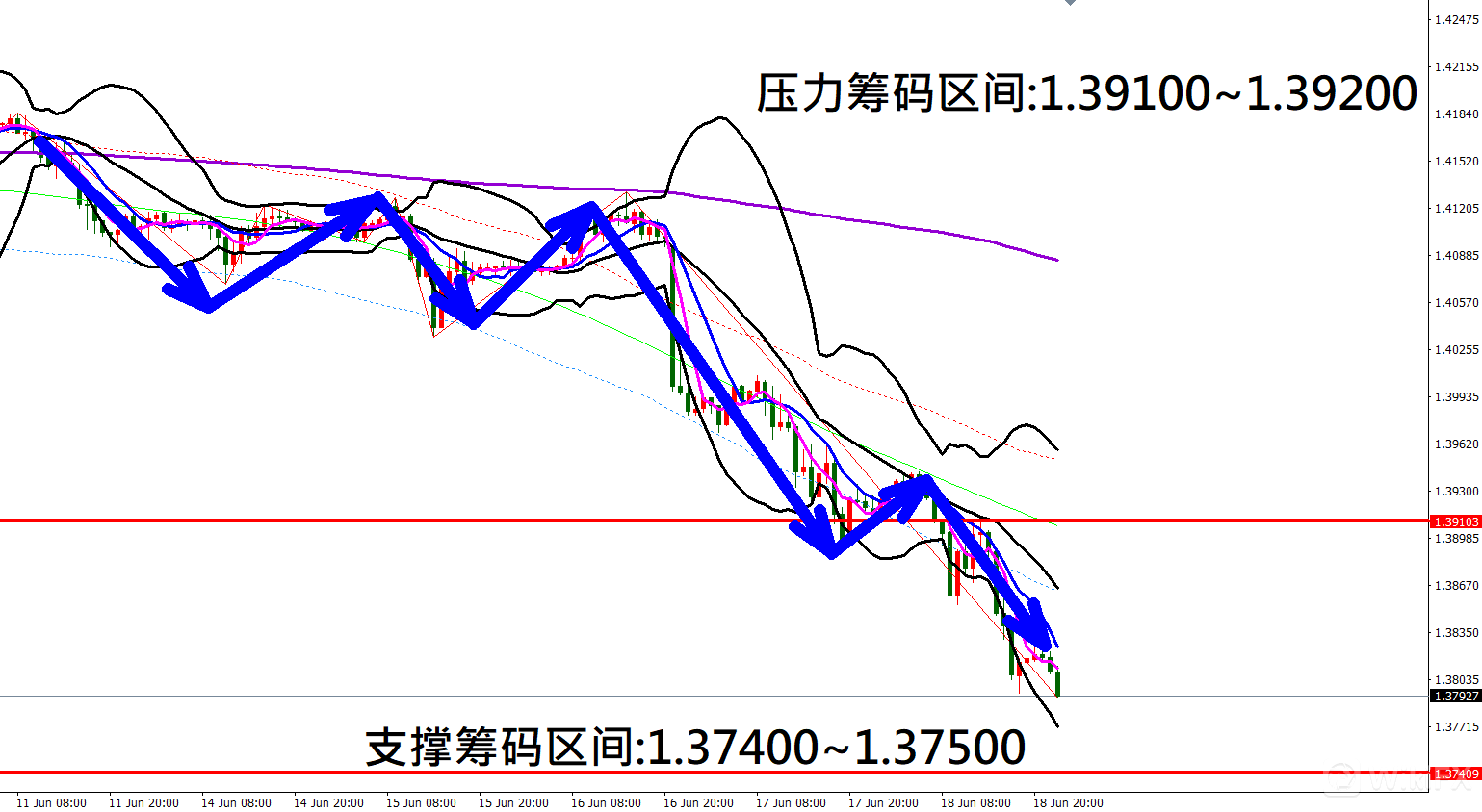 今日英镑/美元(6月21日)早盘在1.37952附近,从技术分析面切入,1小时线级别观察走势符合上周五(18日)预测K棒再度出现下跌行情,目前K棒落在布林通道中轨与下轨之间,同时开口持续朝下扩张,因此有机会反弹遇压后再度向下修正。