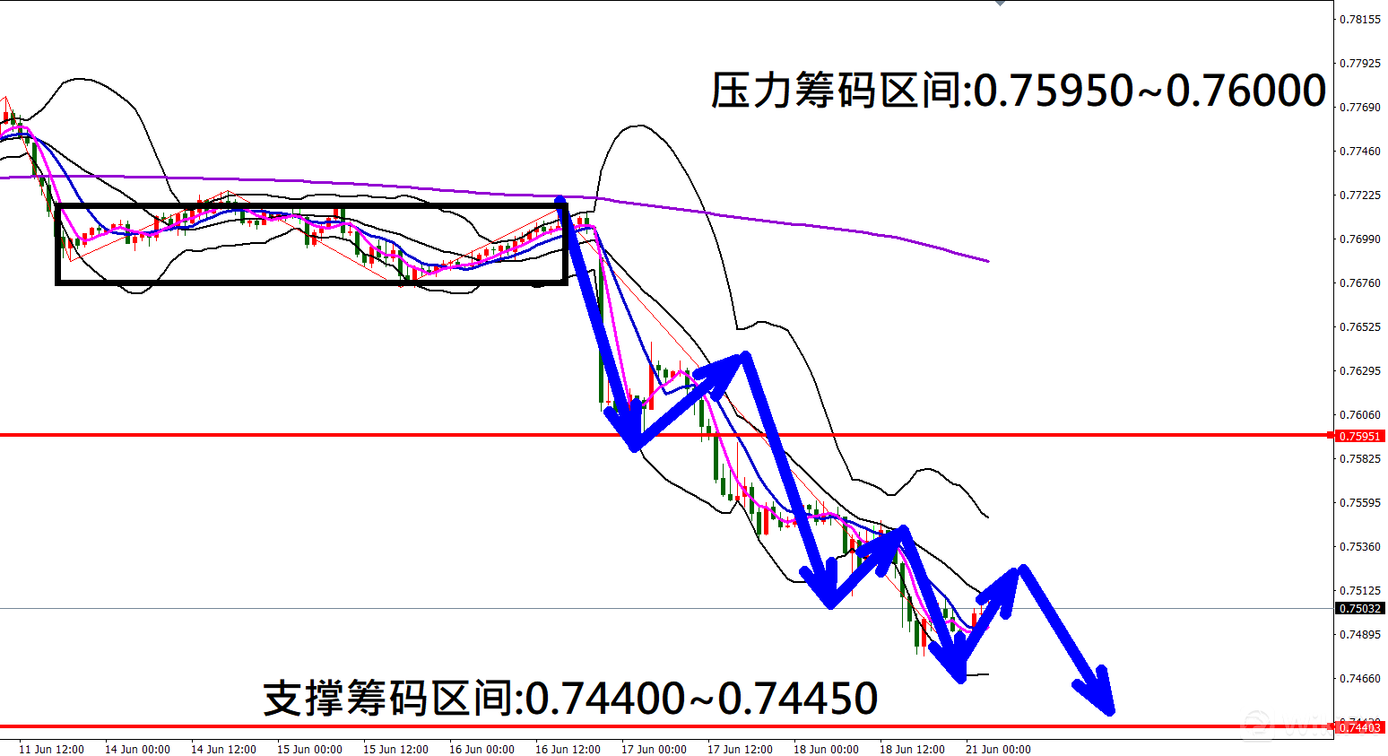 今日澳元/美元(6月21日)早盘在0.74839附近,从技术分析面切入,1小时线级别观察走势架构符合上周五(18日)预测K棒盘中再度大幅下跌,目前K棒落在布林通道中轨与下轨之间,同时开口持续朝下扩张,因此有机会反弹遇压后再度向下修正。