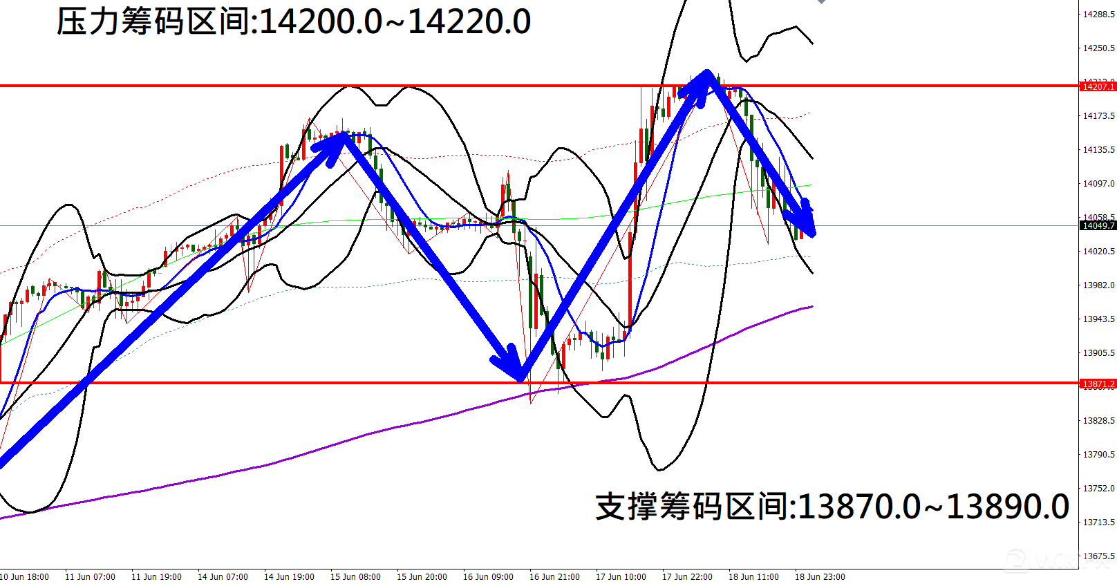 今日纳指(6月21日)早盘在14034.8附近,从技术分析面切入,1小时线级别观察走势架构上周五(18日)K棒高点遇压狭幅震荡后出现大幅拉回修正行情,目前K棒落在布林通道中轨与下轨之间,同时开口转折朝下,因此有机会持续拉回修正。
