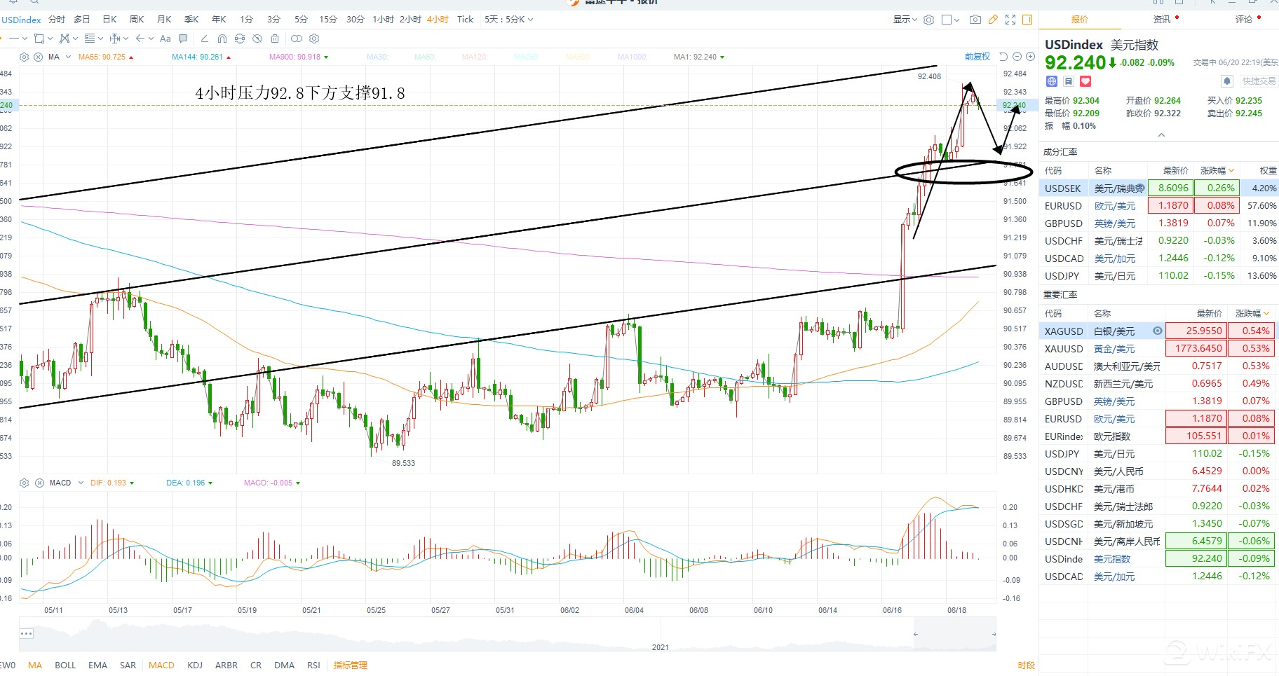 今日数据较少,维持周五行情走势为主,而美元创15个月以来最大周涨幅,非美货币全线大跌,主要是美联储鹰派超预期,支撑美元走强,打压商品,金价大幅下跌,但是影响过去以后会有一段情绪叠加技术层面的修复,切勿追涨美元,谨防冲高回落,技术层面上美元指数4小时压力92.8美元附近,下方重要支撑91.8不能跌破,否则再次进入震荡区间