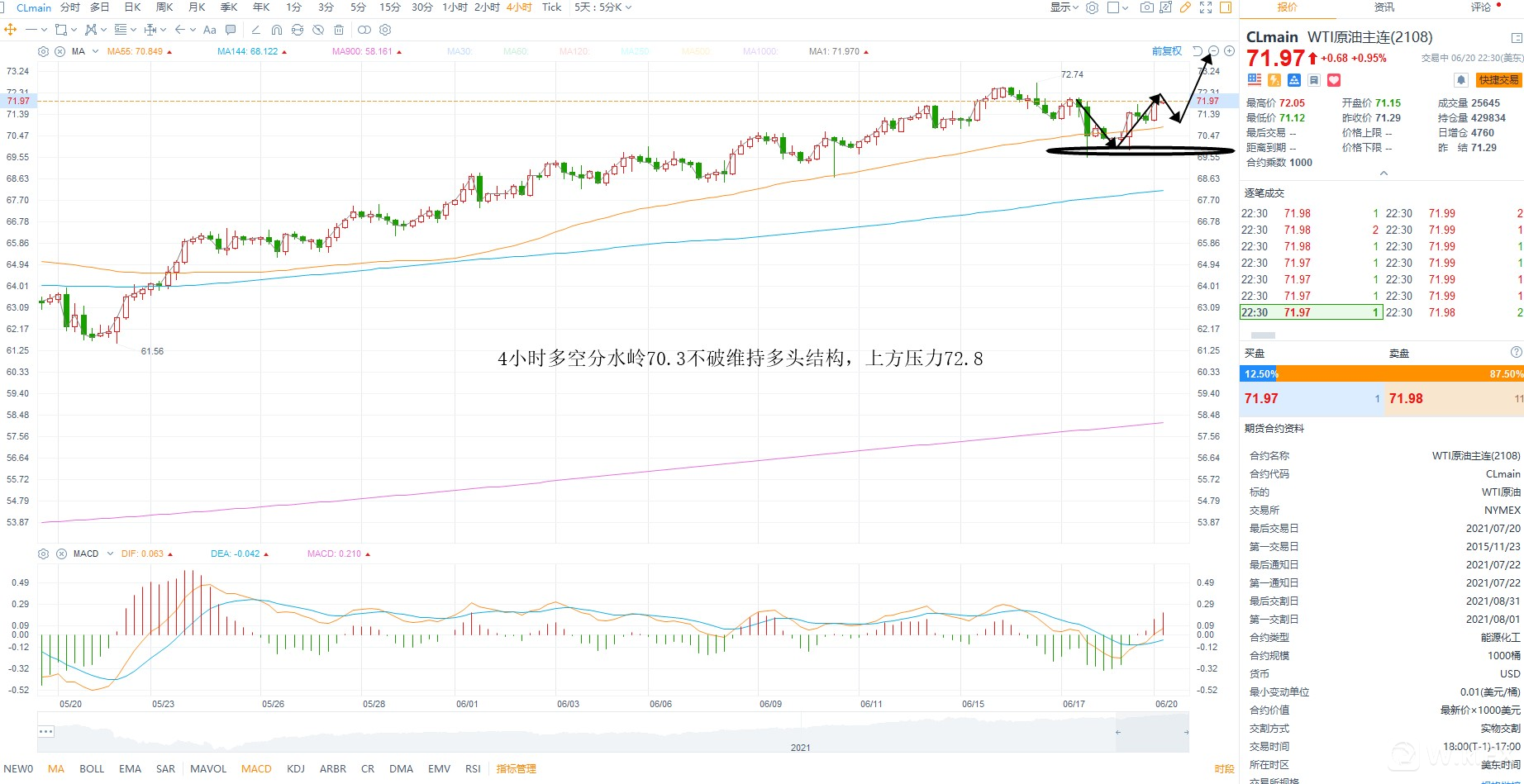 美原油高位震荡之后,再次收回跌幅,短期而言基本面上供需失衡没有解决,需求端增长预期依然旺盛,因此存在新高的可能性,注意,这里是基本面推动的趋势走强,因此想要形成头部,短期难度比较大,4小时级别多空分水岭70.3不破则很难出现大级别回调,上方压力看前高72.8是否突破,周线级别密集成交区间在74附近