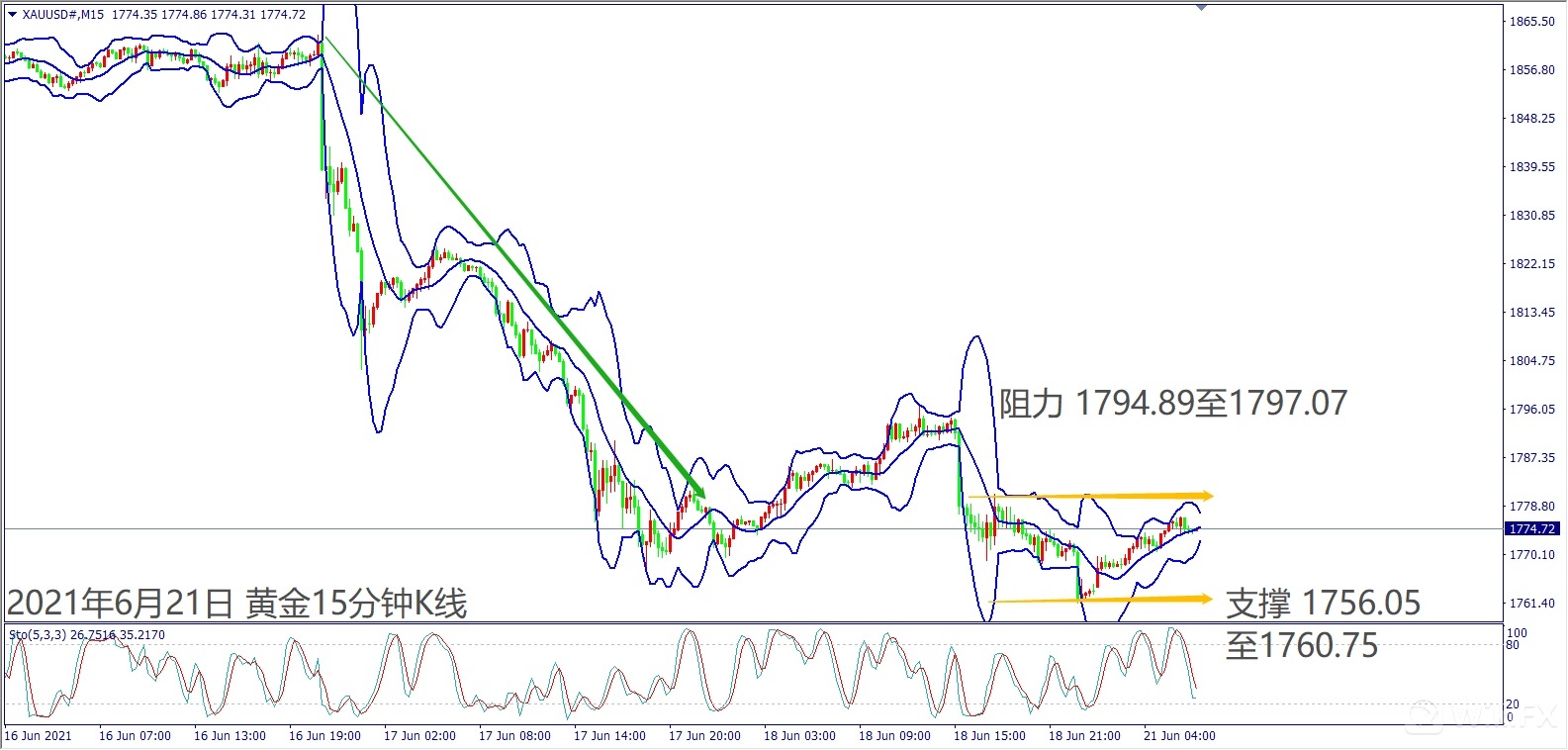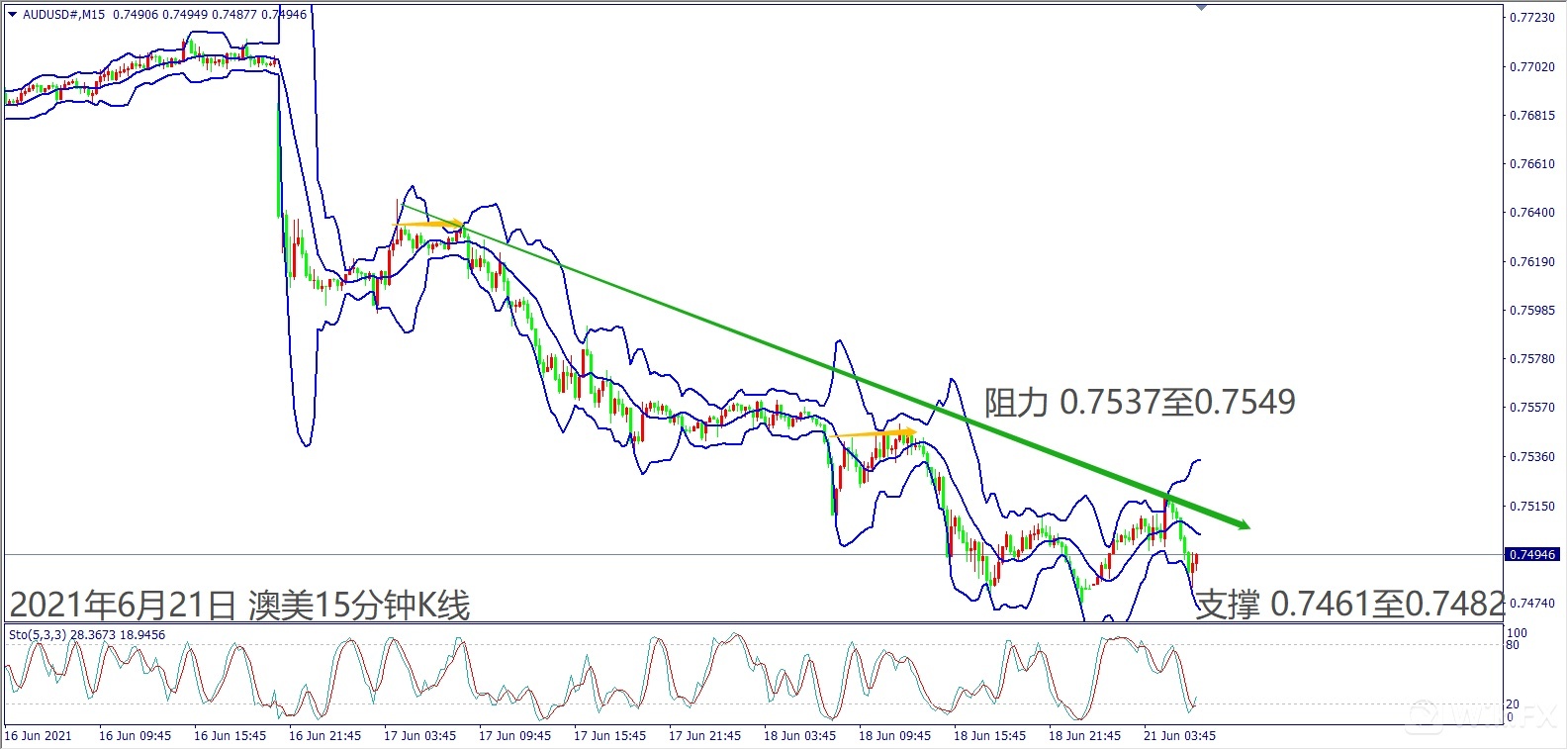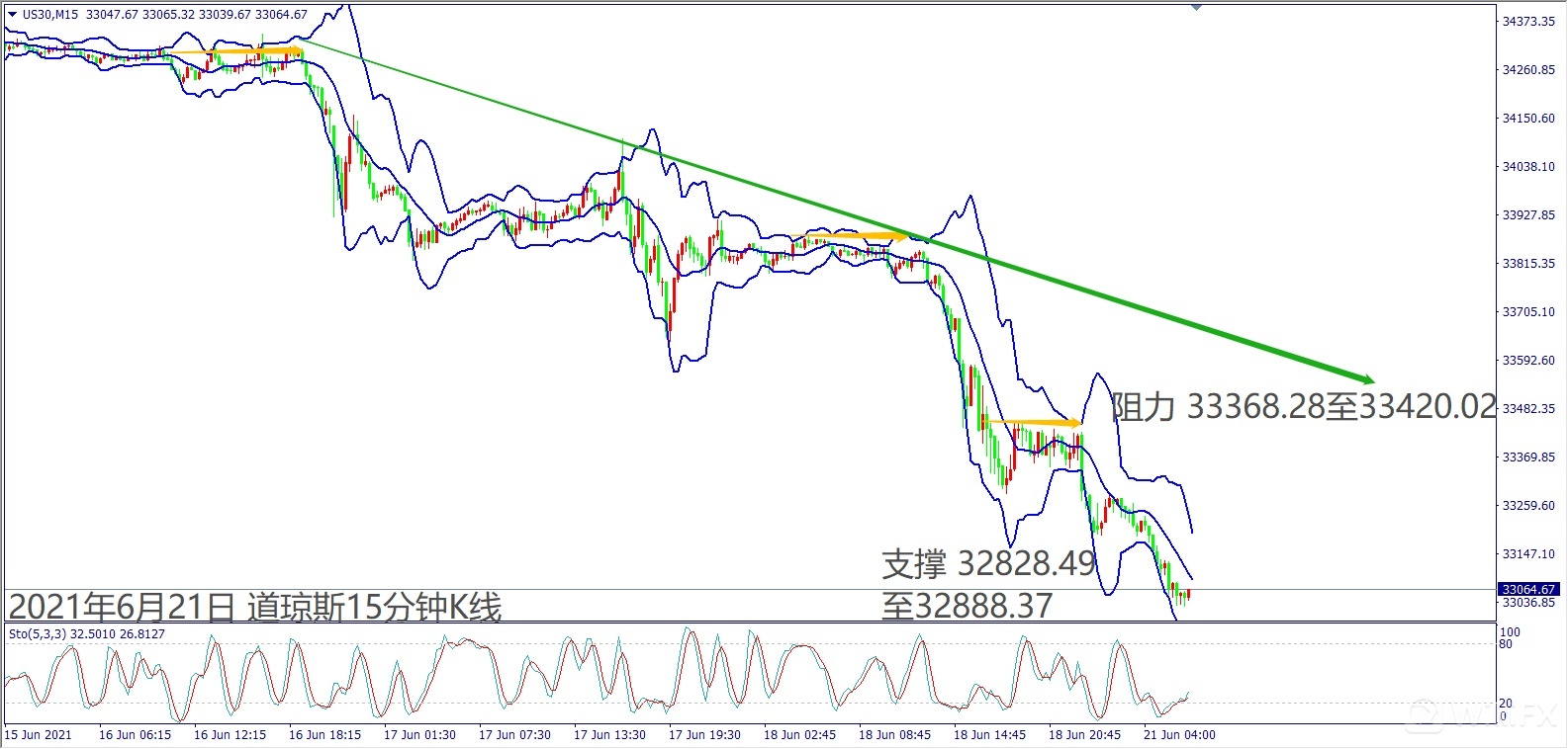 日级别线图,长阴烛跌破5月最低价格,短中均线全面下行,将大机会延续空方下跌走势;15分钟K线,短线出现盘跌走势,下降趋势线冲不过,可能下探支撑。