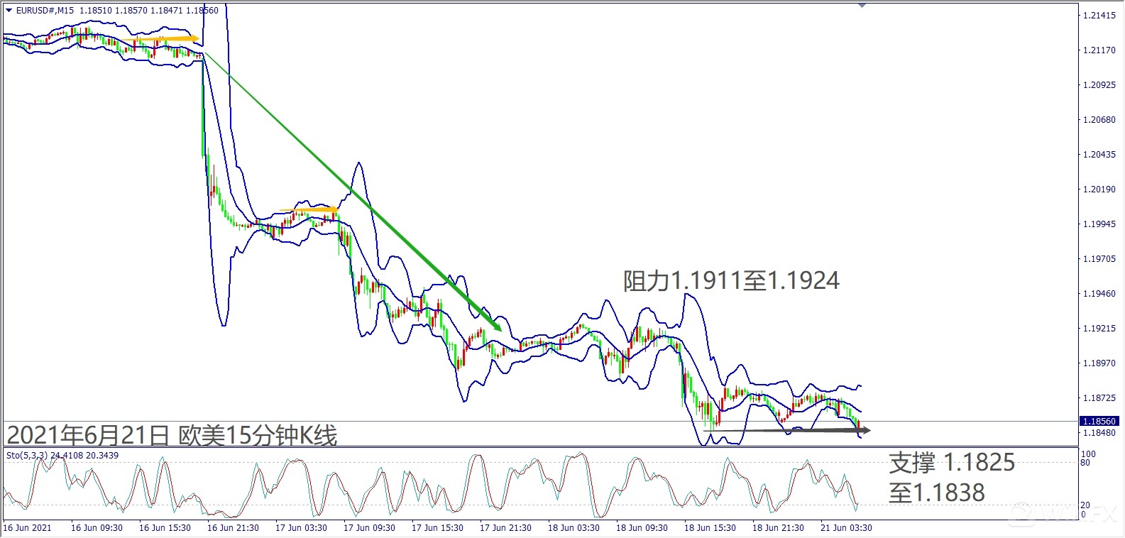 日级别线图,近三天大跌270个点,KD空方背离,可能出现反弹;15分钟K线,短线盘跌走势趋缓,如果维持在1.1850上方盘整,可能挑战1.1900关口。