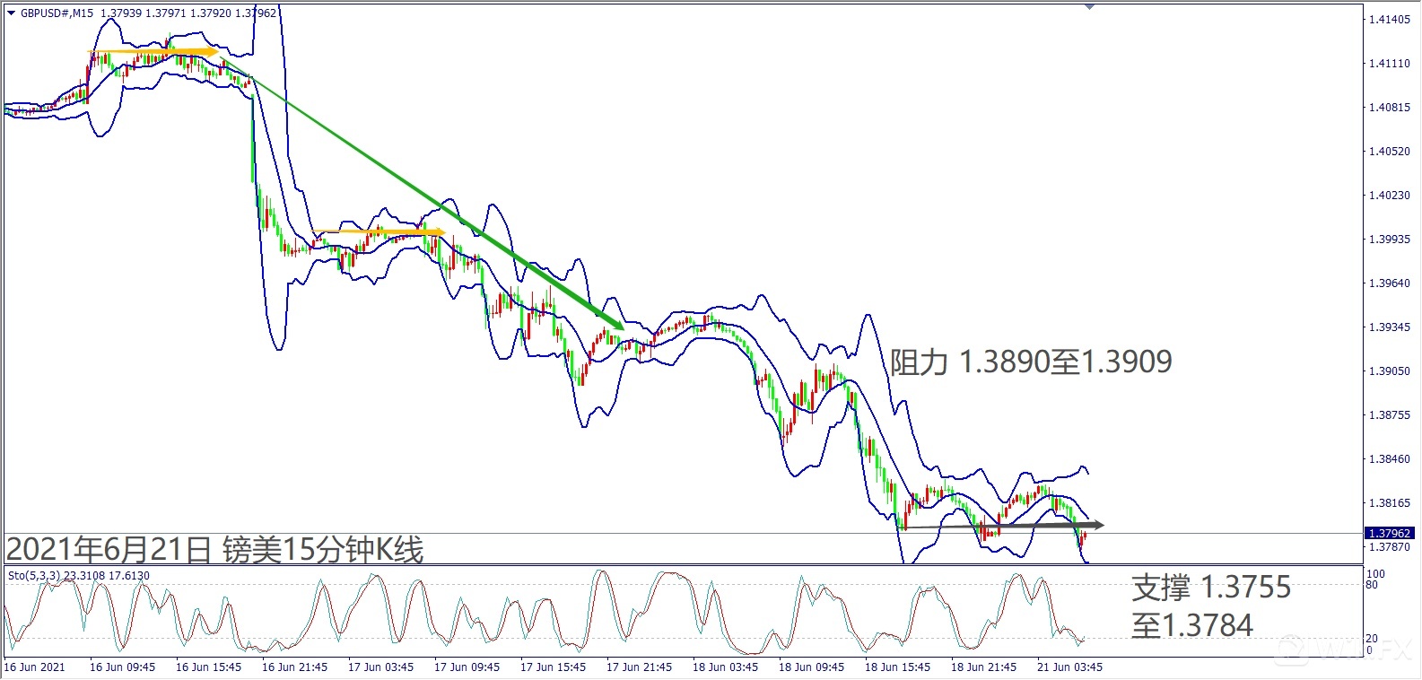 日级别线图,连续三天大跌,出现KD空方背离,可能出现反弹;15分钟K线,短线盘跌走势趋缓,若守在1.3800附近盘整,可能反弹挑战1.3900关口。