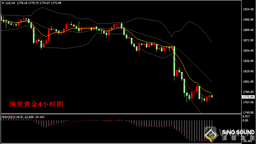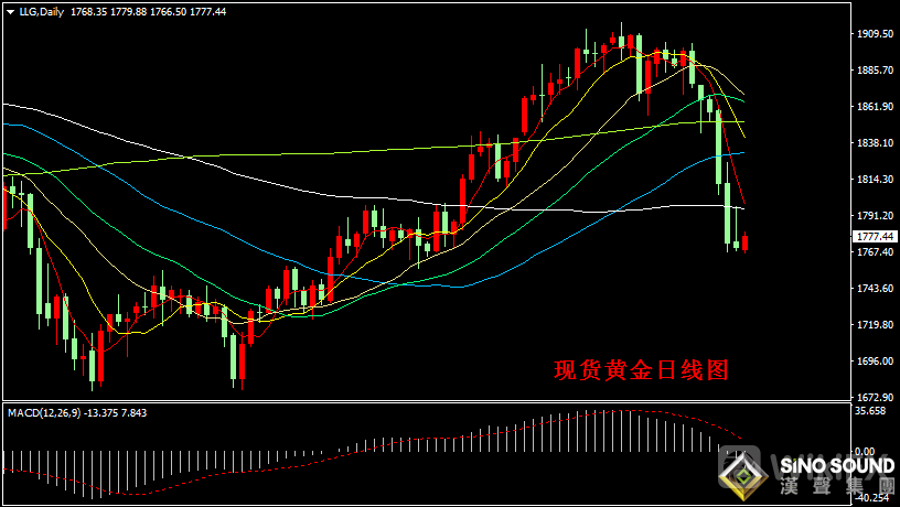现货黄金日线图看,日内金价呈现区间振荡走势,金价持续在1765-1780区间内运行。目前金价短期均线形成空头排列对金价短线上涨形成压制,日内金价短线冲高空间有限。同时,金价100日均线对昨日金价压制作用较为明显,昨日金价高点1795(100日均线)附近存在较大阻力。日线指标看,MACD指标负动能柱逐步增加,RSI指标维持在超卖线30位置附近徘徊。