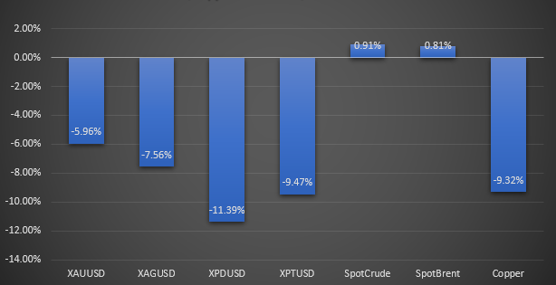 商品市场上周涨跌幅 来源:Pepperstone MT4