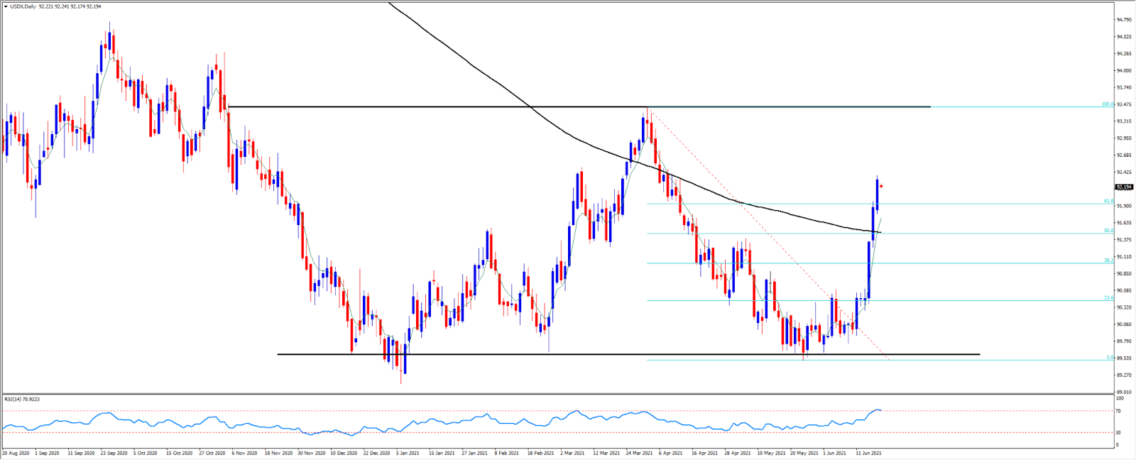 尽管美联储还没有正式谈及缩表,但指数还是突破了200天均线和61.8%的回档位。如果此前持续数月的美元空头头寸能够被大规模解除,那年内高点93.44将会进入多头的目标范围。