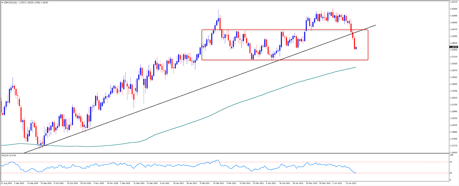 屋漏偏逢连夜雨。在美元走强的同时,英国的新冠疫情(delta变异株)出现反弹导致全面解封被推迟一个月,对英镑形成二次打击。在1.40上方盘整了一个月之后,汇价已经重新回到1.3670-1.40区域。