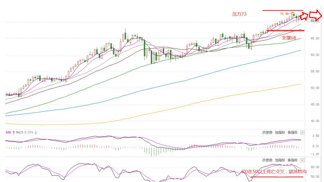 技术面,短期均线呈现多方排列,10、20日均线均具备较强支撑。KD在50以上死亡交叉,震荡结构。