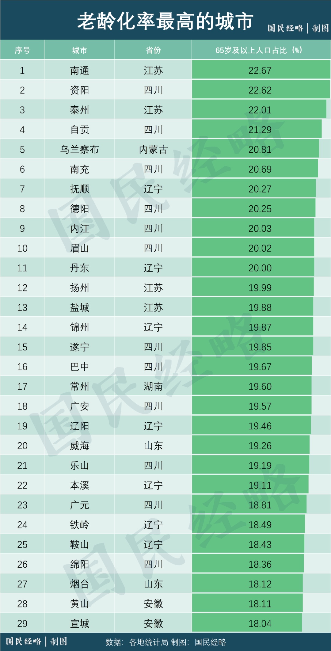 江苏南通,以22.67%的老龄化率位居各大城市之首,而东北最高的城市为辽宁抚顺,老龄化率20.27%。