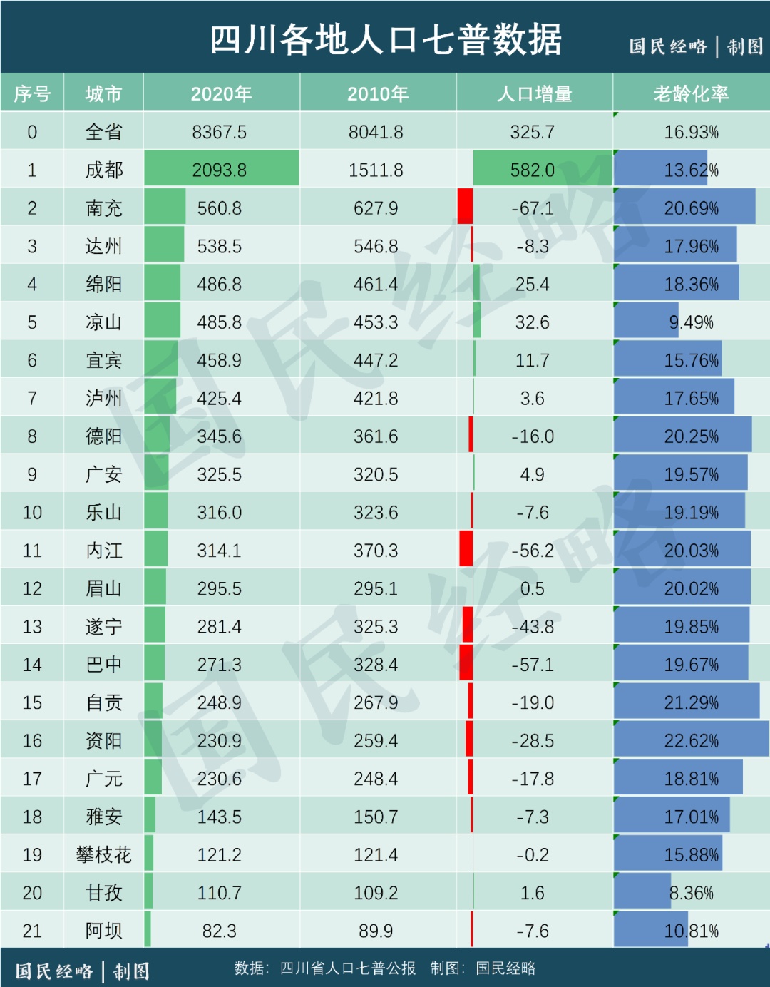 四川竟然有6个地市老龄化率超过20%,最高的资阳市高达22.62%,与南通基本相当。只有凉山、阿坝、甘孜3个少数民族聚居的自治州,低于全国平均水平。