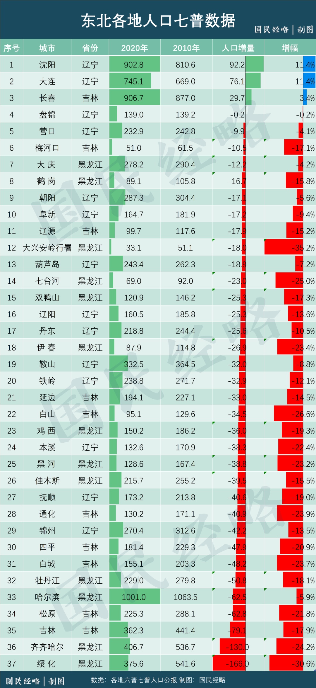 城市数据更凸显了这一趋势的严峻性。在东北30多个地市里,只有沈阳、大连、长春三个中心城市人口有所增长,其他所有地市都在减少。