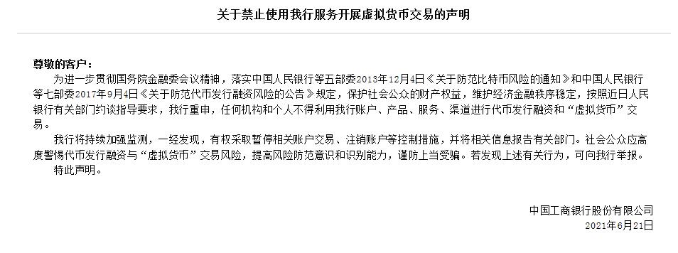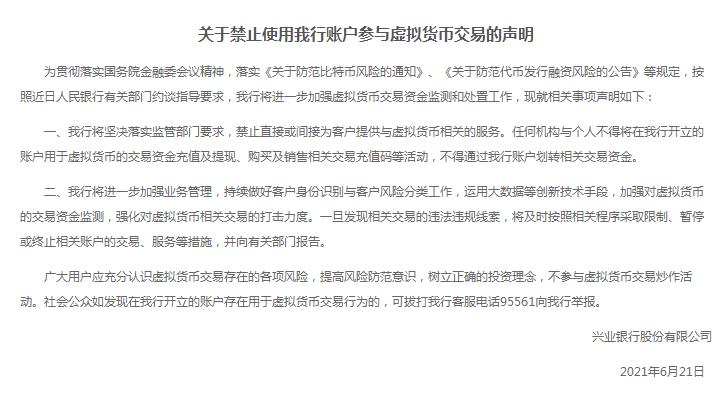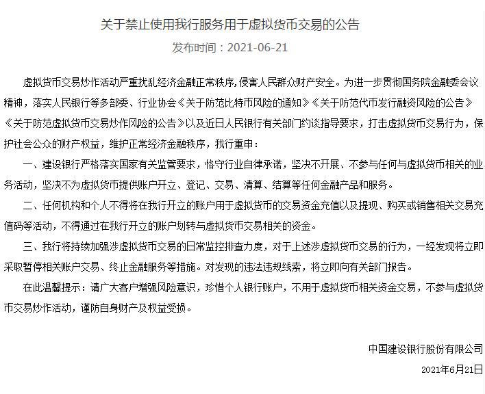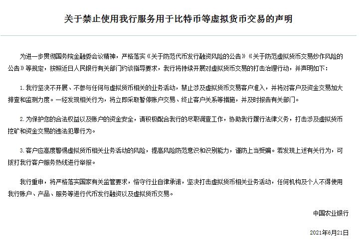 中国建设银行、中国工商银行、中国农业银行、中国邮政储蓄银行、中国兴业银行相继发布了关于禁止使用我行服务用于虚拟货币交易的声明。支付宝也表示,将监控排查涉及虚拟货币的交易行为,一经发现将立即封堵。