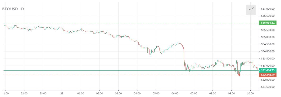 比特币近1个小时持续下跌,最低触及32348.29美元/枚。