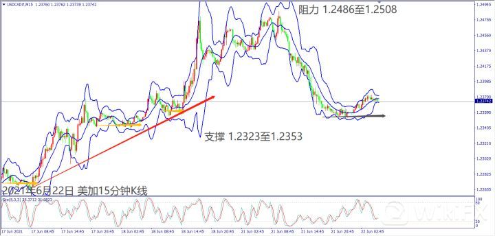 日级别线图,过前高后回落收长阴烛,5日均线若守稳,有望延续多方涨势;15分钟K线,短线涨多回落至1.2350附近盘整,一旦强势突破1.2400关口,将大可能挑战上方阻力。