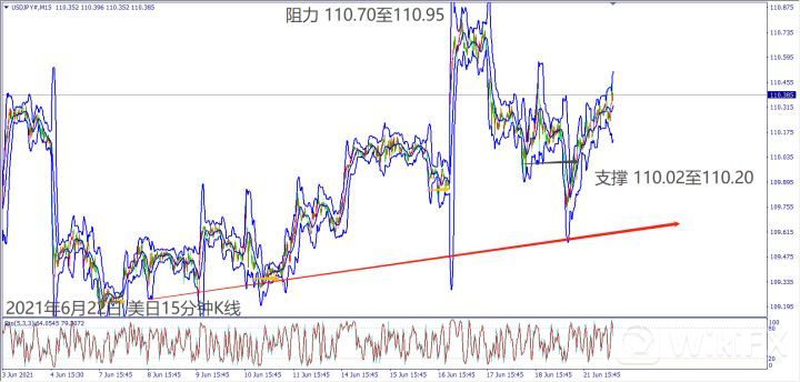 日级别线图,处于盘涨走势,昨日出现十字星反转信号,一旦突破5日均线有望延续涨势;15分钟K线,昨日出现V型反转,如果守在110关口打底,大有机会挑战上方阻力。