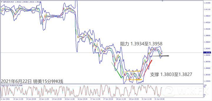 日级别线图,长阳烛站回1.3900关口,5日均线反压,一旦跌破120日均线可能再度转跌;15分钟K线,昨日出现箱型反转,短线反弹一旦回落跌破1.3900关口,将大机会再测下方支撑。