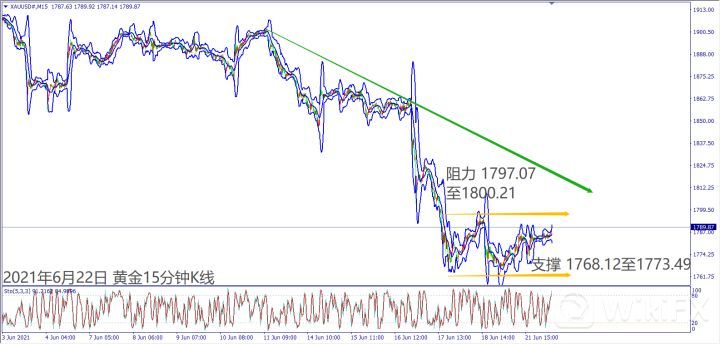 日级别线图,跌深反弹收阳烛,5日均线冲不过,可能回落至1760美元反复测底;15分钟K线,若要形成盘底,大有机会在1760~1800区间震荡,若冲高回落将测下方支撑。