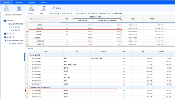 应用过程:对项目成果文件进行复核时,发现4号宿舍楼的单方造价为2115.5元/m2,低于6号宿舍楼。通过指标神器对比分析,得出4号楼成本、含量等指标的详细科目组成,并调用已存储到企业指标库的同业态的6号宿舍楼指标,进行快速对比,发现是4号楼模板工程科目单方造价差距过大,进一步检查清单确认是4号楼矩形柱模板清单漏项的原因。