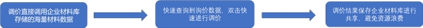 应用过程:前期先筛选典型项目,在企业材料库中上传相关材料数据。后续做项目时,可直接调用企业材料库中的工程调价数据库或者询价材料库,需要询价的材料可根据材料名称、规格参数等信息快速定位到调价数据库、询价数据库中匹配的材料,双击即可快速完成调价。单体调价的结果也可快速保存到企业材料库中,进行共享,避免资源浪费。