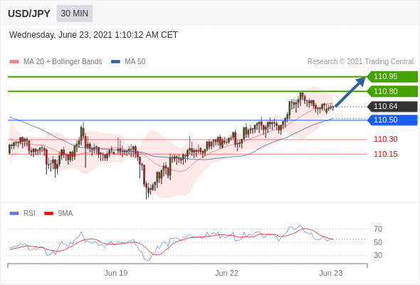 交易策略: 在 110.50 之上,看涨,目标价位为 110.80 ,然后为 110.95 。