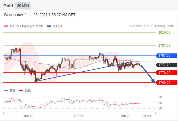 交易策略: 在 1787.00 之下,看跌,目标价位为 1770.00 ,然后为 1760.00 。