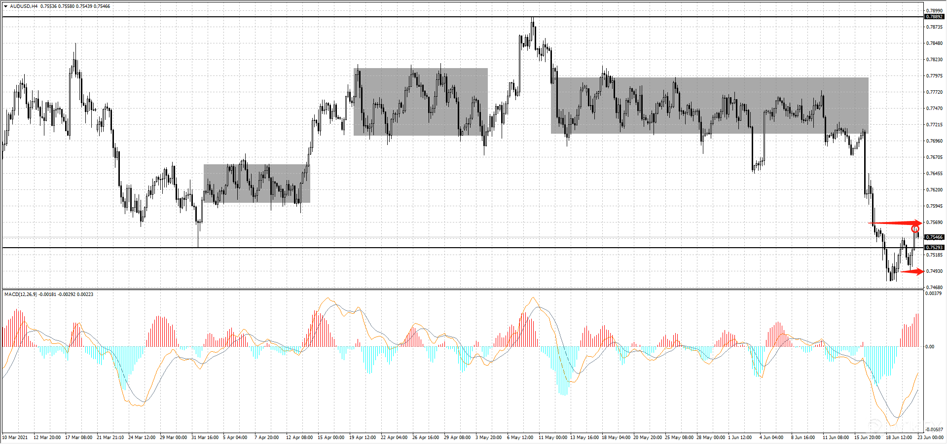 澳元4小时图上看, 昨日上涨,最高触及0.7563(如图红圈处),后迅速回调进入0.7545-0.7497箱型整理区间内,目前未能有效脱离箱型整理区间,仍然未区间震荡, 可以仍然以震荡思维做单。阻力位:0.7563,支撑位:0.7497。