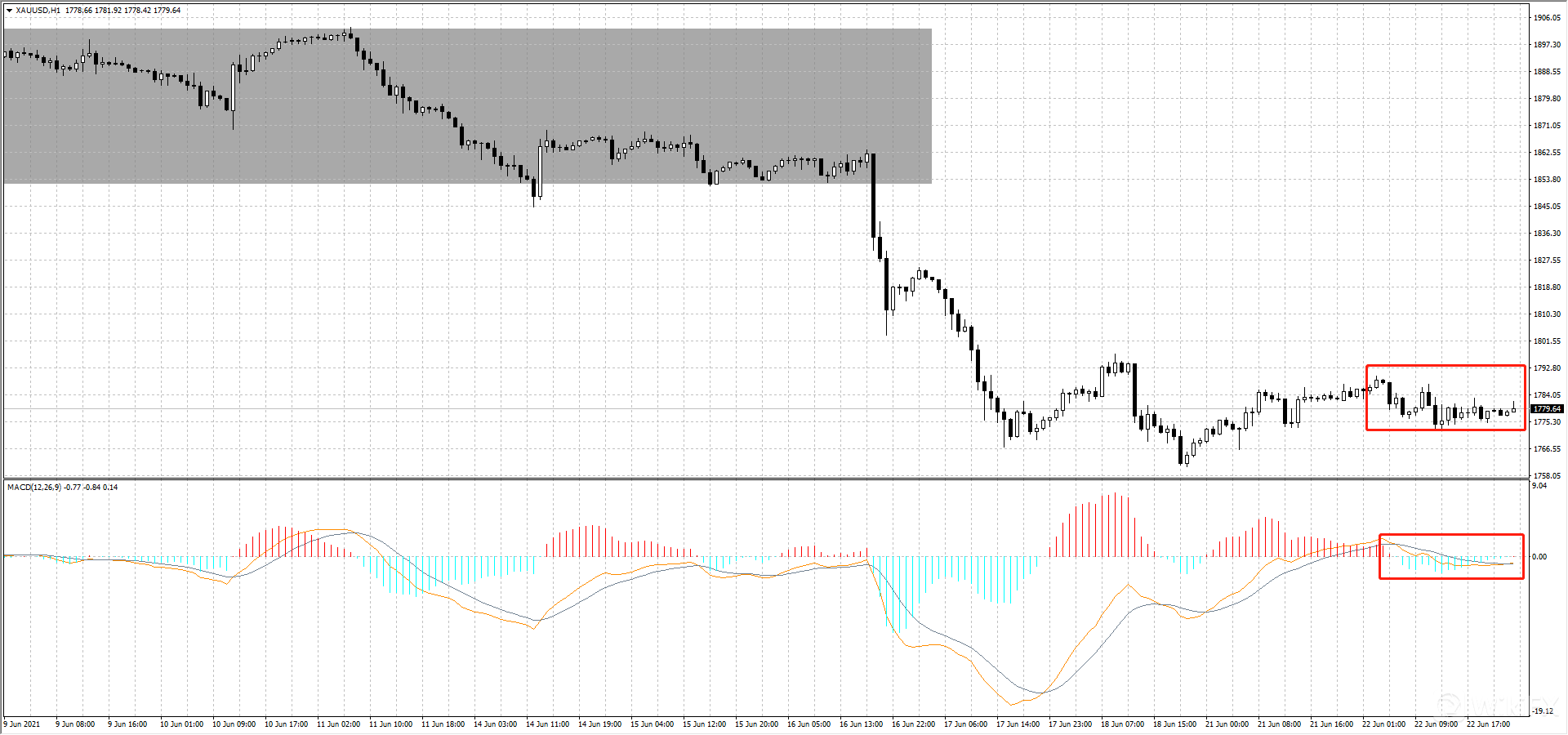 黄金1小时图上看,在1790-1772之间窄幅震荡,MACD双线重合,正在寻找突破方向,目前已观望为主。