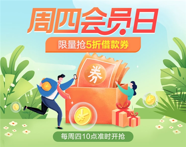活动期间,每周四上午10点,已开通任性贷的用户登录苏宁金融APP,首页进入“任性贷借钱”频道,在会员日活动页可限量抢借款优惠券,5折利率折扣券、9折利率折扣券、20元借款优惠券、5天借款免息券限4选1。提醒一下,每人每月限领1张,不能同时领取哦。