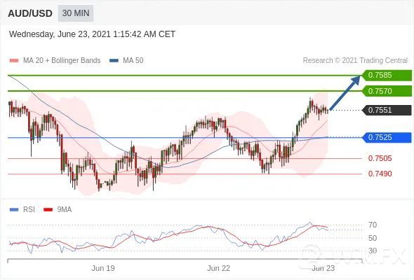 交易策略:在0.7525之上,看涨,目标价位为0.7570,然后为0.7585。